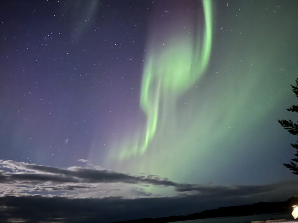 写真のように綺麗な緑色とはいかないものの、肉眼であれがオーロラだ、と確認できるくらいにはしっかりと出ていました。
