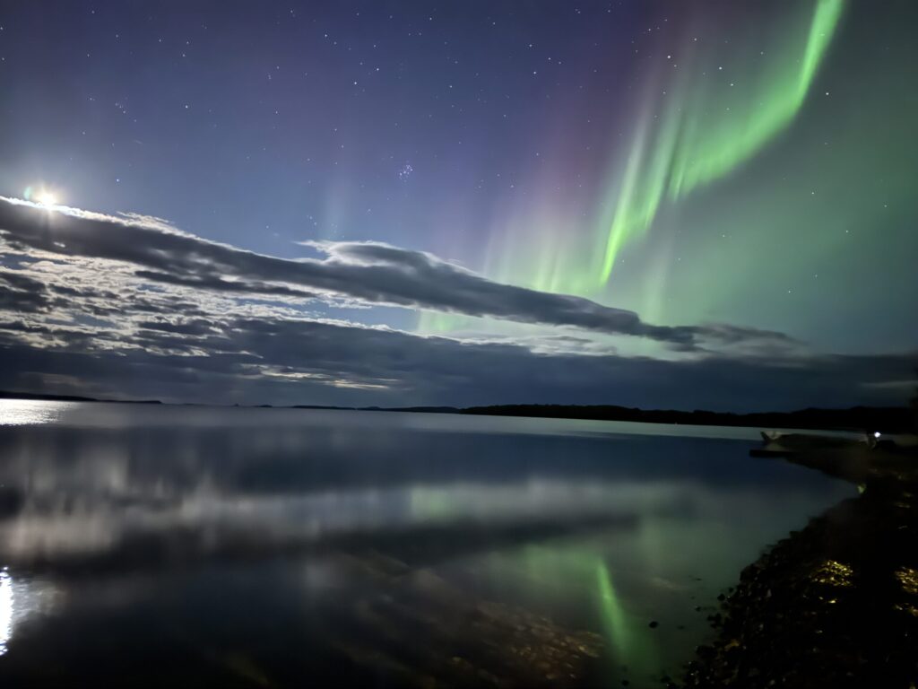 雲はありますが、イナリ湖に反射するオーロラもハッキリみることができました。