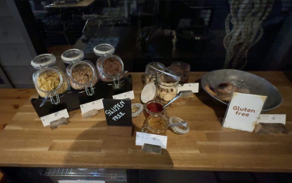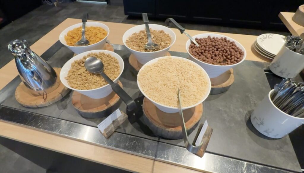 コーンフレーク類や、グルテンフリーのパンやお菓子、オートミール粥なども用意されていました。
