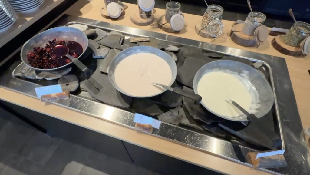 ヨーグルトやブルーベリーソース、ドライフルーツなどがありました。