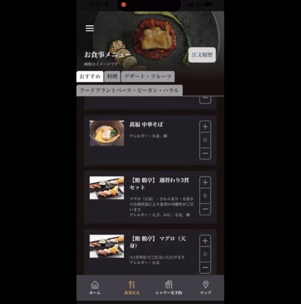食事は座席にあるQRコードとチケットを読み込むと、注文できるメニューが出てきます。