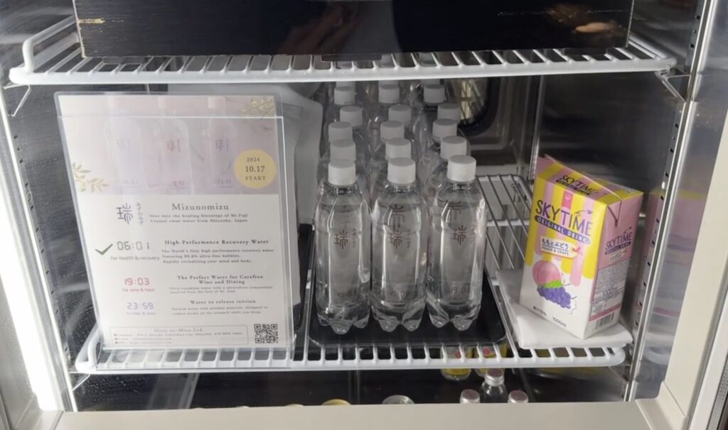 冷蔵庫には、ヨーグルト、ジュース、お水などがありました。