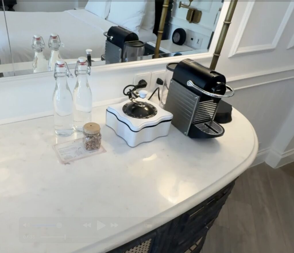 机には、お水、エスプレッソマシーン、紅茶、ナッツのお菓子などがあります。