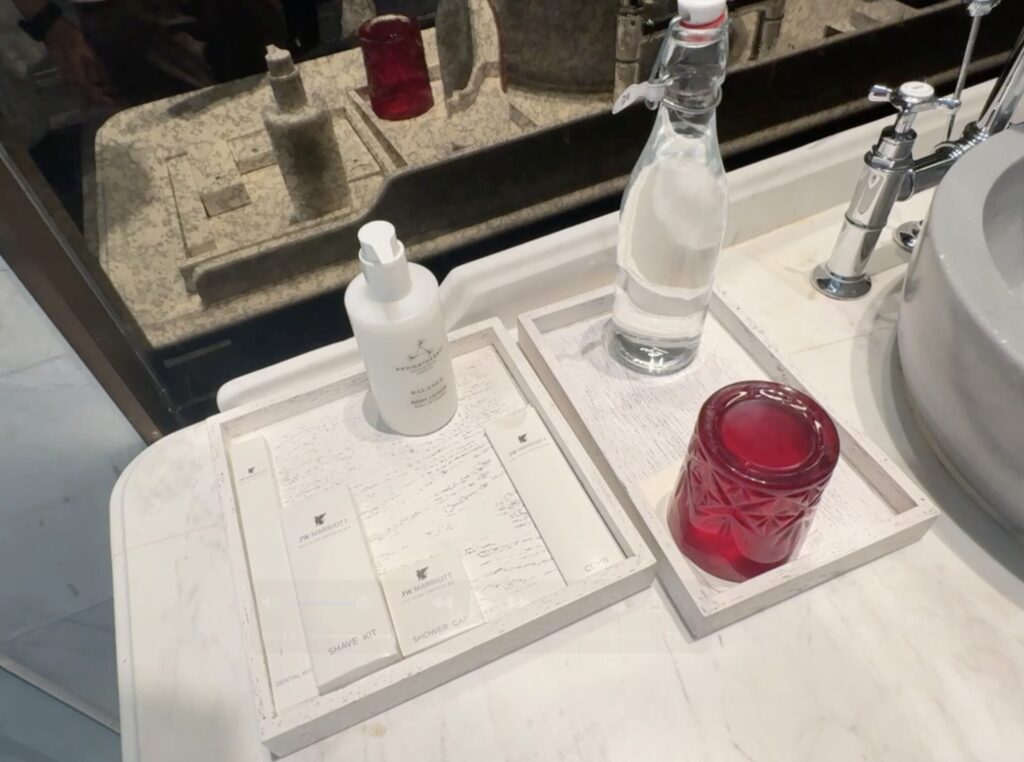 反対側の洗面台には、クシやボディークリームなどがあり、女性と男性用で分かれているのかもしれませんね。
