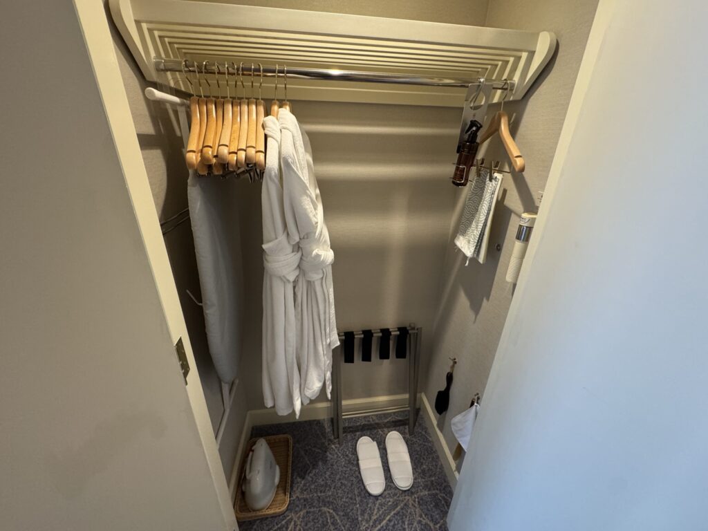 クローゼットも広々しており、中には消臭スプレーやバスローブ、アイロン、スリッパなどがありました。