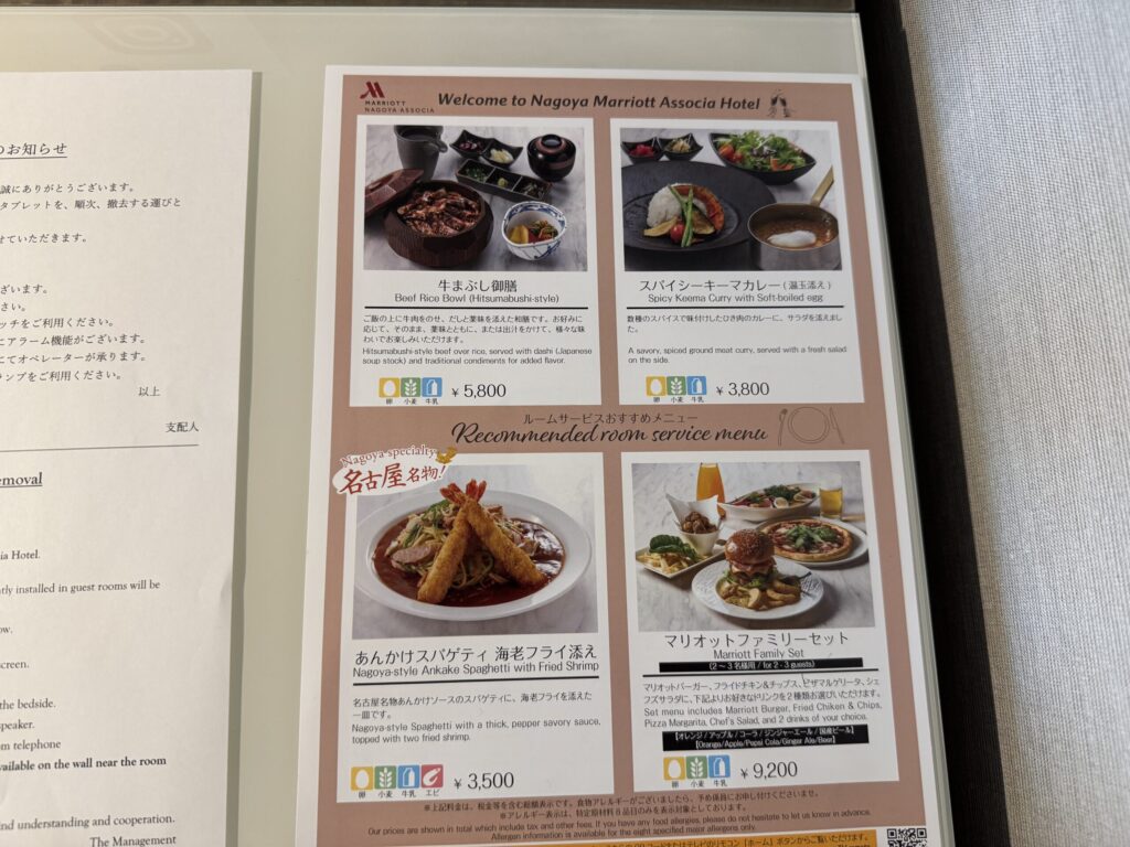 ルームサービスで愛知のご当地料理も注文できるみたいです。どれも美味しそうですね。