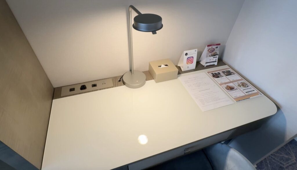 デスクには様々なタイプの充電スポットやデスクライトがあり、作業時に助かりますね。