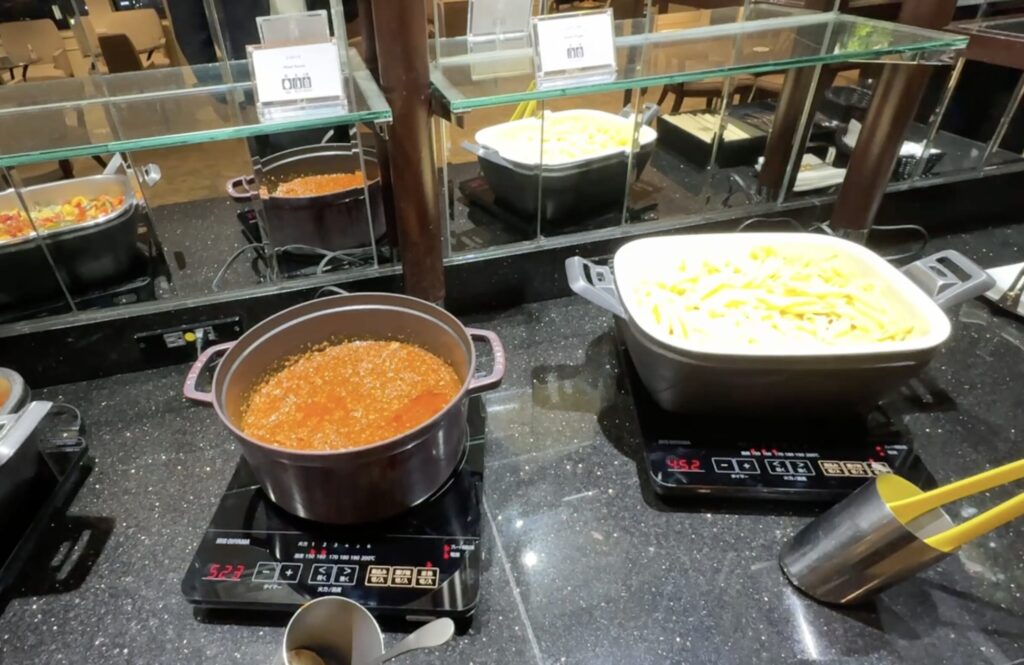 アメリカンドック、パプリカをアヒージョのように煮た料理、ミートソースパスタがありました。