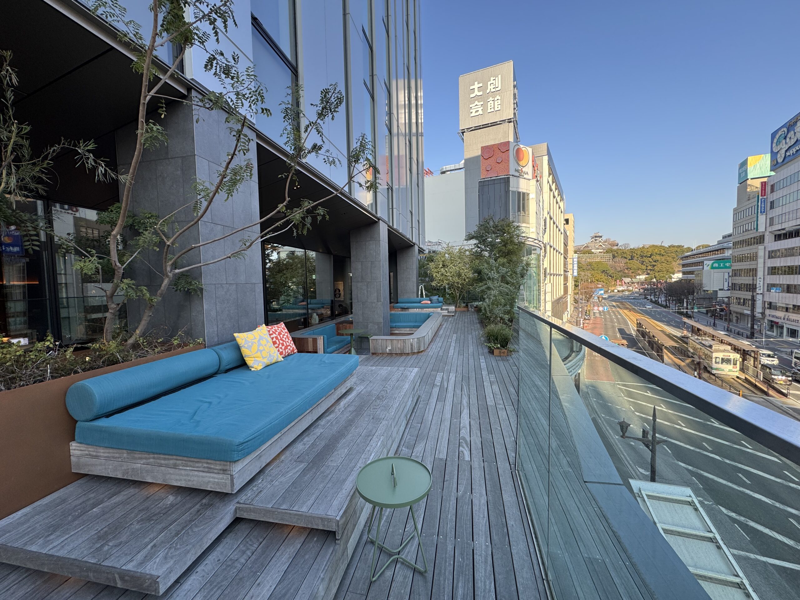外のテラスからは熊本城を見ることができます。