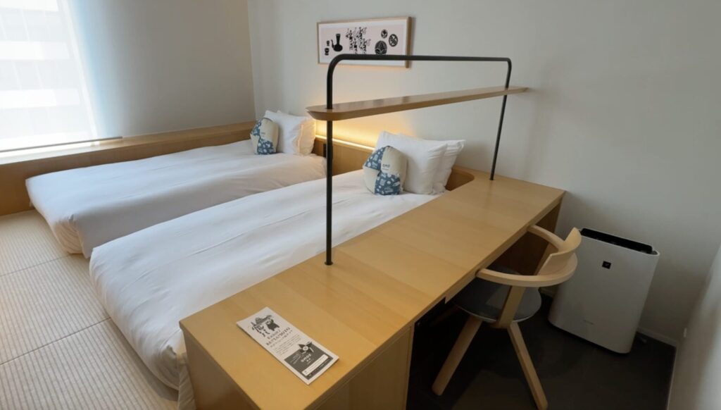 ベッドはツインで、作業もしやすいデスクもあります。