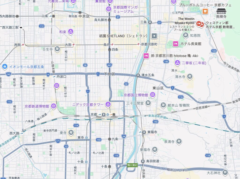 ウェスティン都京都は京都駅から電車で25分ほど、車で20分ほどの位置にあります。