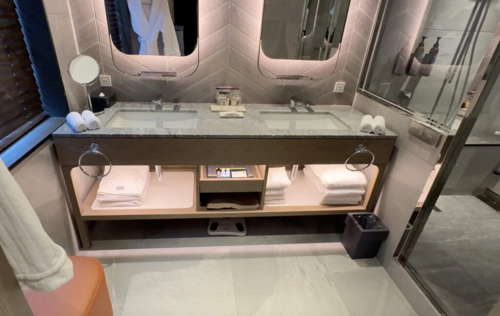 洗面台も2つあり、朝の準備に便利そうですね。拡大鏡も置いてあるので、化粧の際に便利ですね。