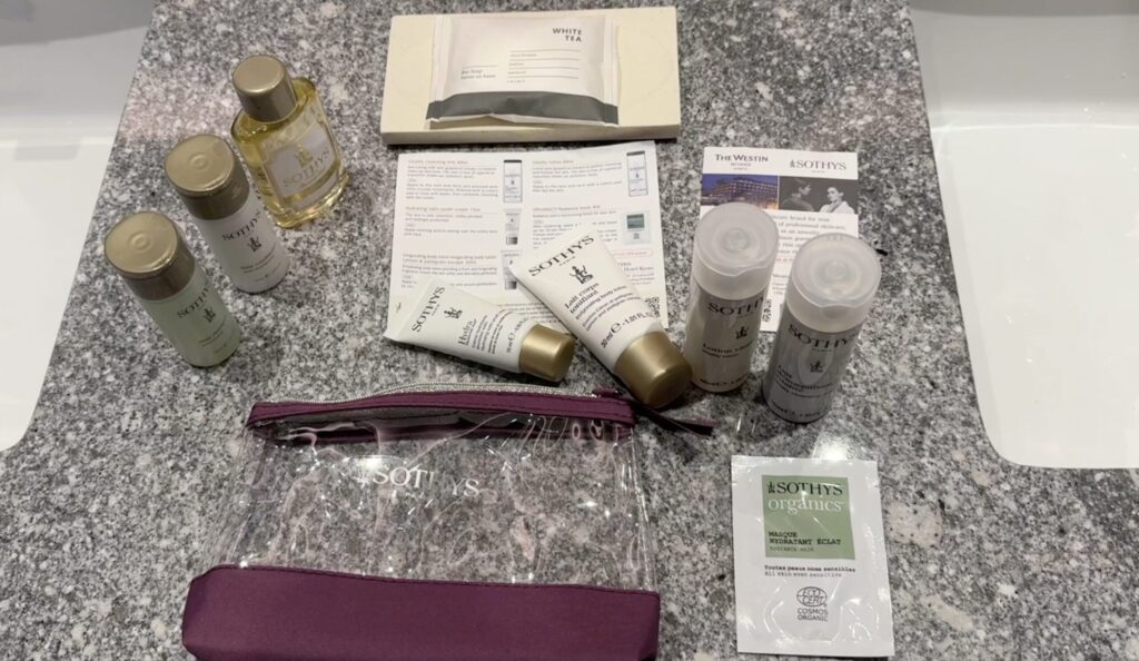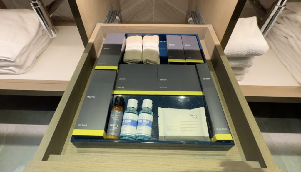 アメニティも、ウェスティン共通のものが一通りありますね。クシ、マウスウォッシュ、ボディークリームなどがあります。