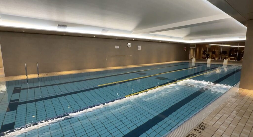 屋内は温水プールなので、多少は温かかったです。広々しており、利用人数も多くなかったので、広々泳ぐことができました。