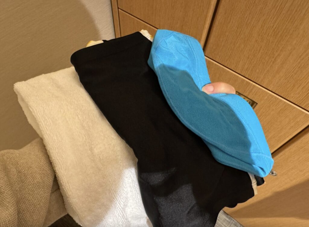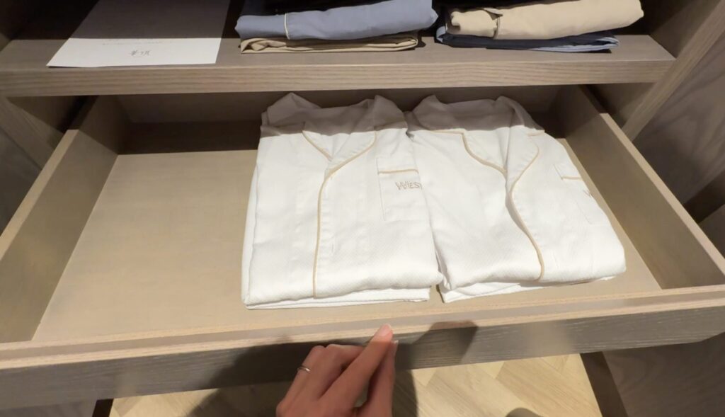 引き出しにはコインランドリーの袋や、温泉施設のスパ「華頂」に着ていける館内着もありました。