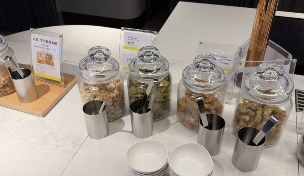 この時間帯はティータイムで、ドリンクとお菓子が置いてありました。