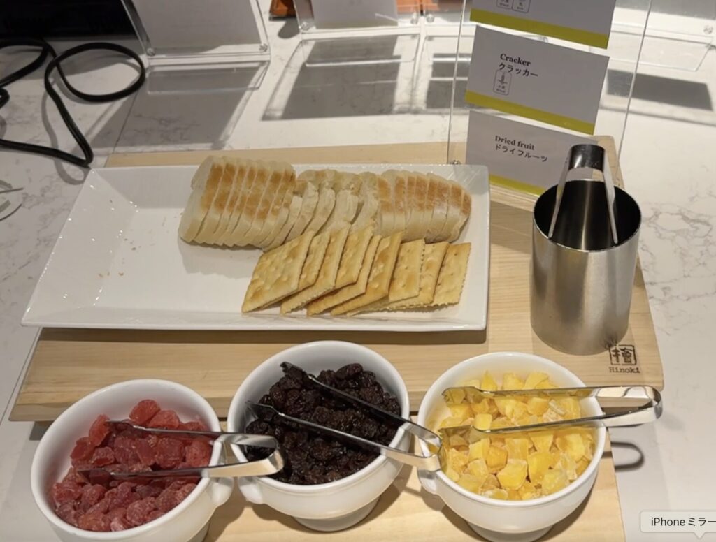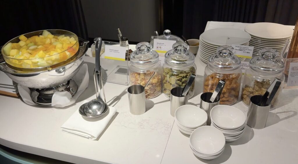 カクテルタイムのラウンジでは、お酒に合いそうな軽食が用意されていました。