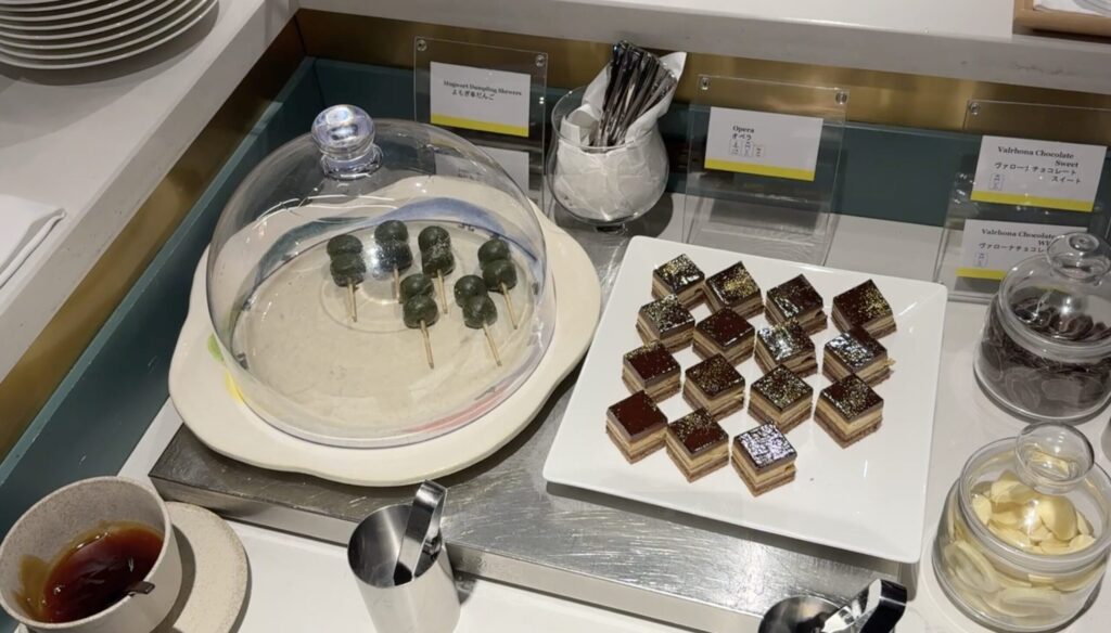 デザートはよもぎ団子、ケーキのオペラがありました。よもぎ団子は、みたらしもかけられるようになっていました。