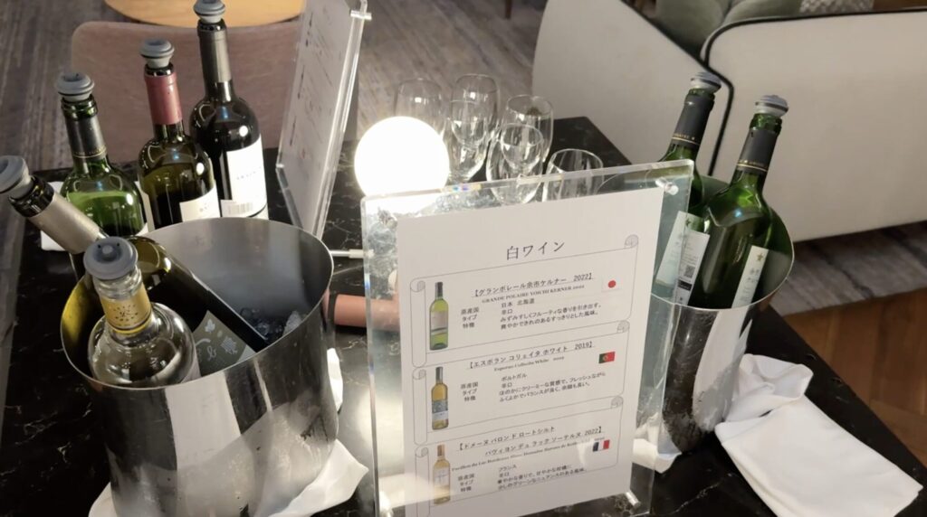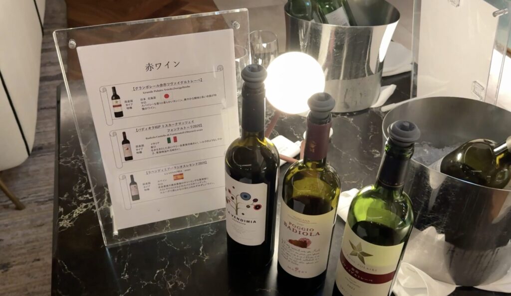 お酒は、赤ワイン、白ワインがそれぞれ3種類ずつ用意されていました。