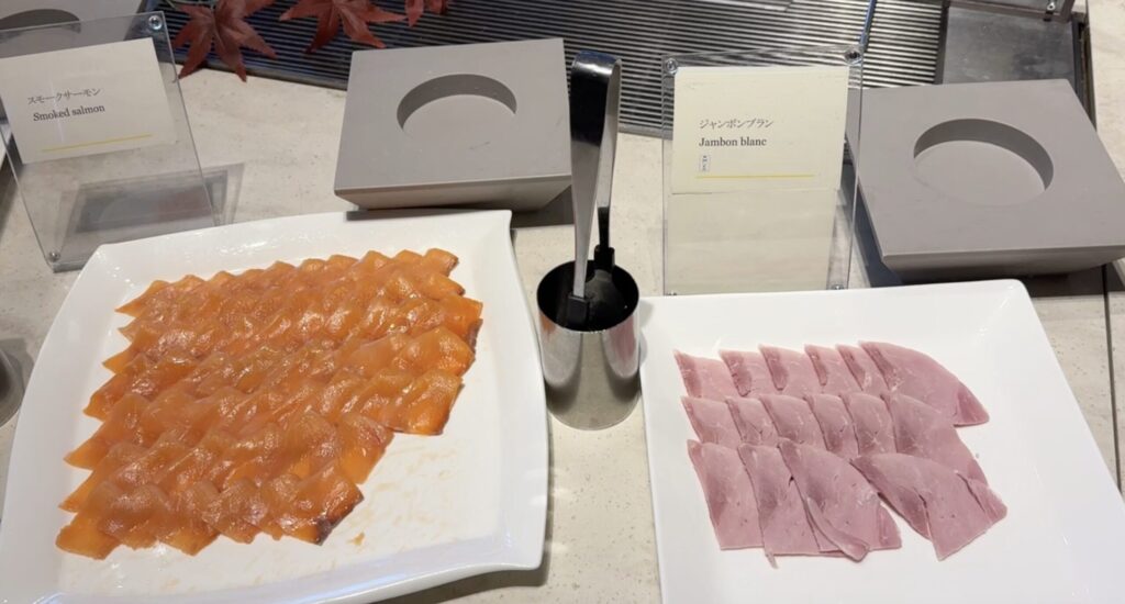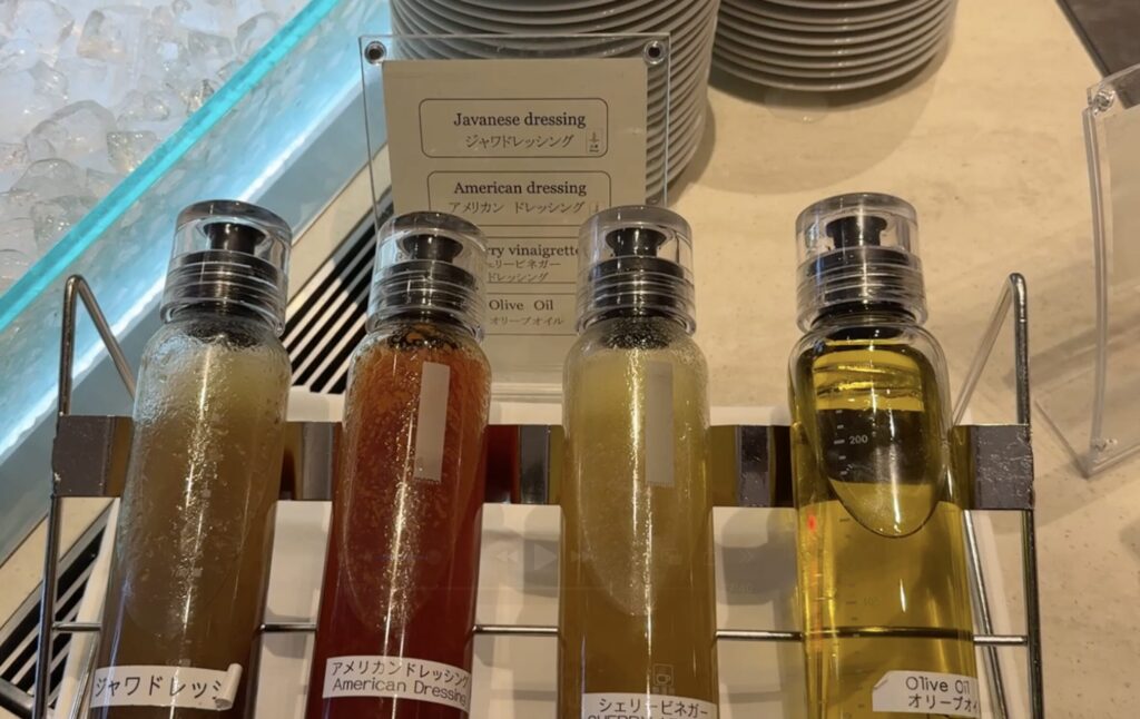 サーモン、ハム、スチームチキンがあり、ドレッシングの種類も豊富でした。