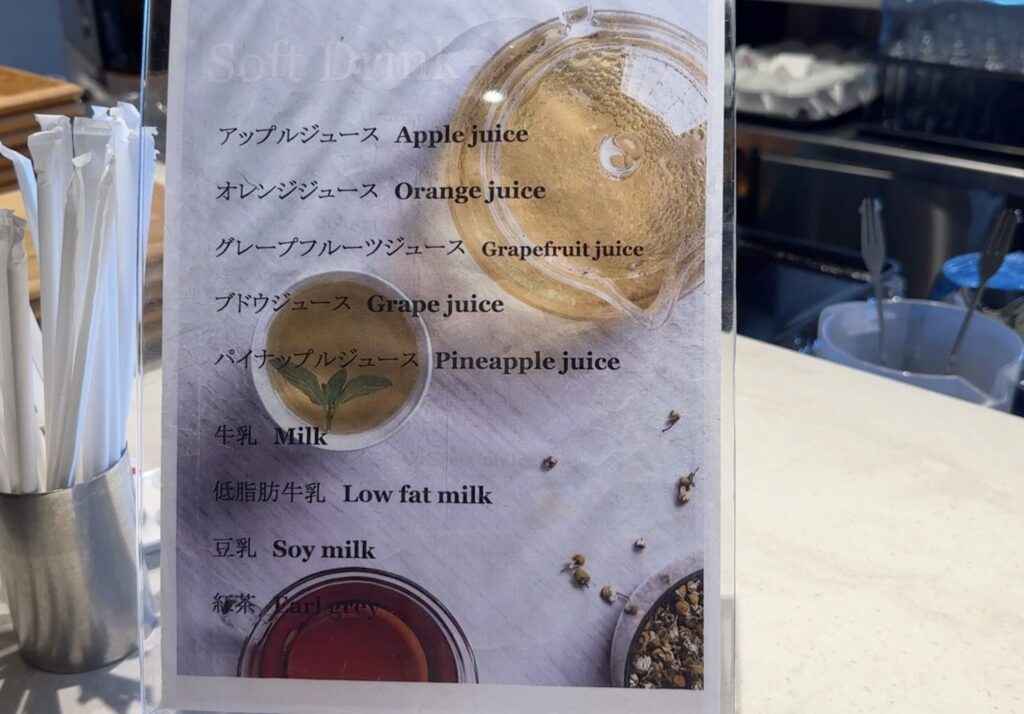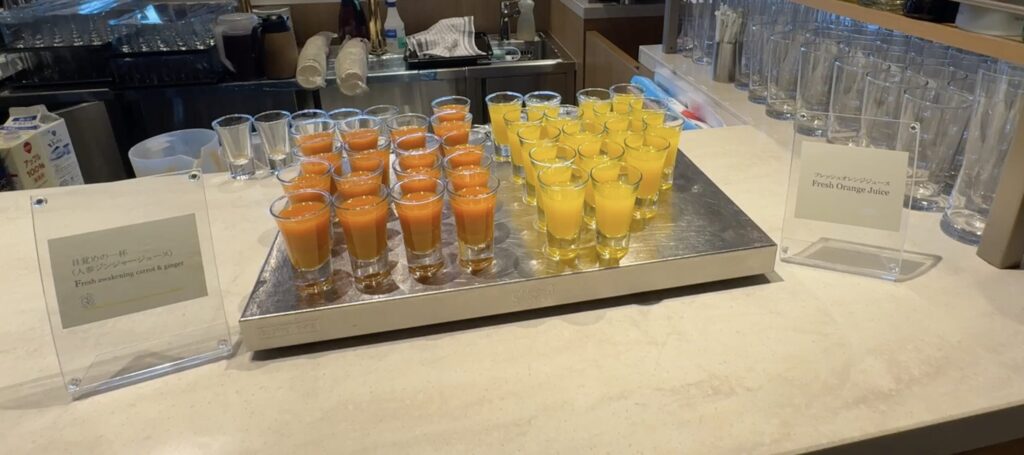 ジュース類も、アップル、オレンジ、グレープフルーツ、にんじんベースのスムージーや、オレンジ搾りたてのオレンジジュースがあります。