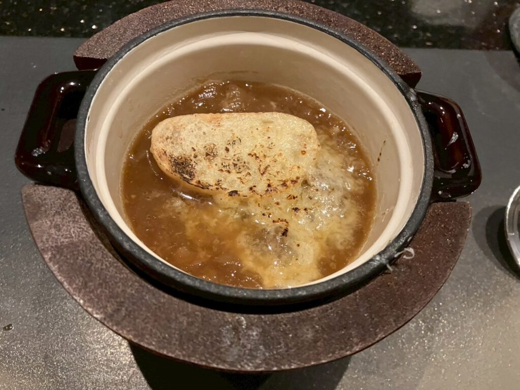 新玉ねぎのグラチネスープはその場で温め、上にあるチーズもバーナーで炙っていただきました。