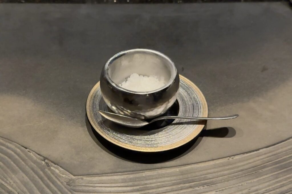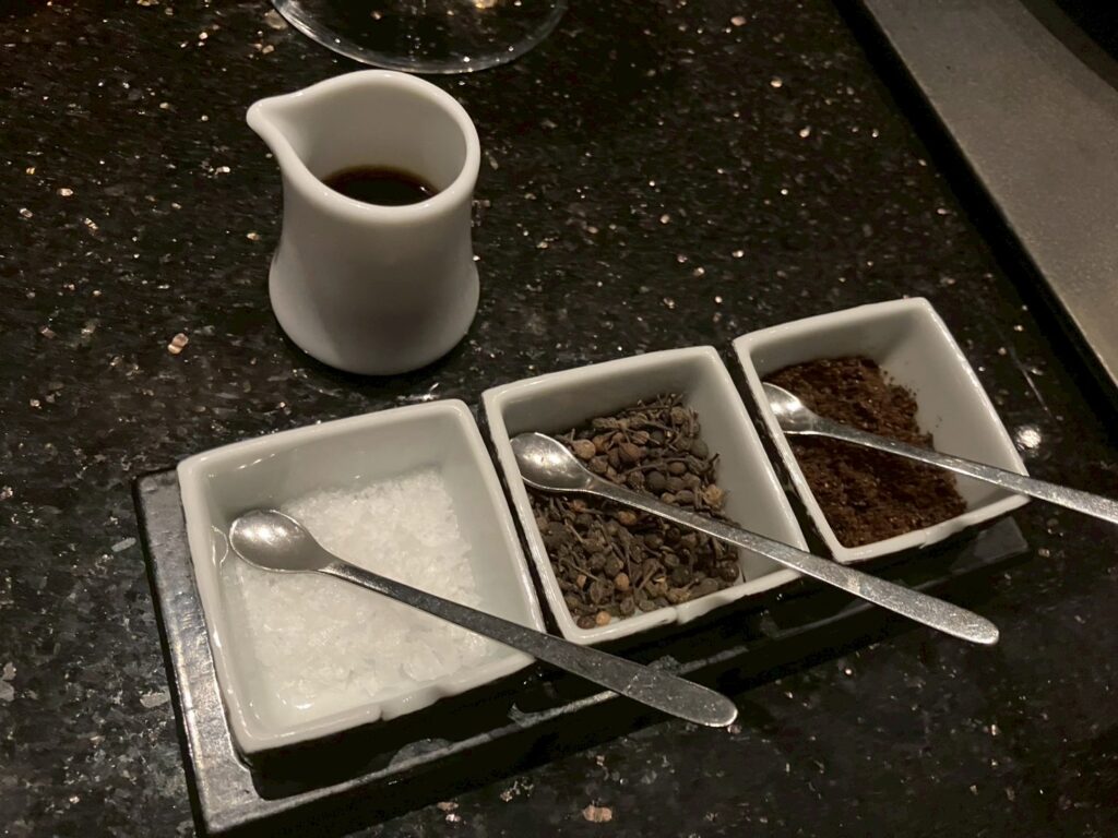 イギリスマルドンのお塩、マダガスカルのワイルドペッパー、京都の黒七味が用意されていました。