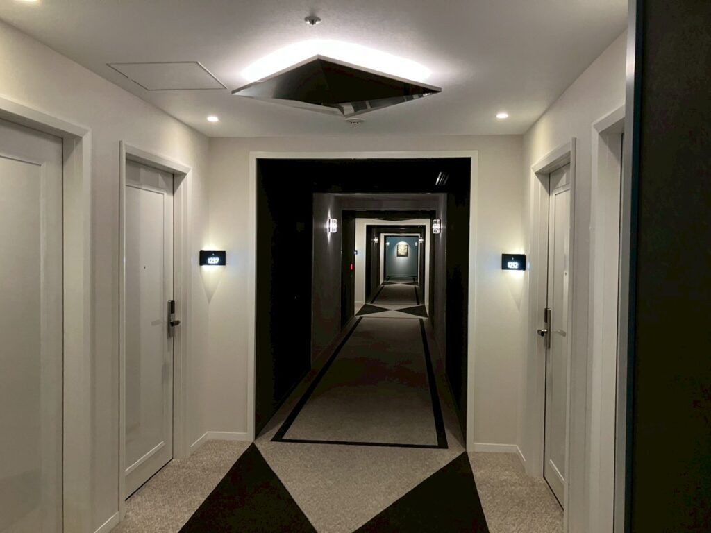12階にあるお部屋の前の廊下は、扉が白基調で、素敵ですね。