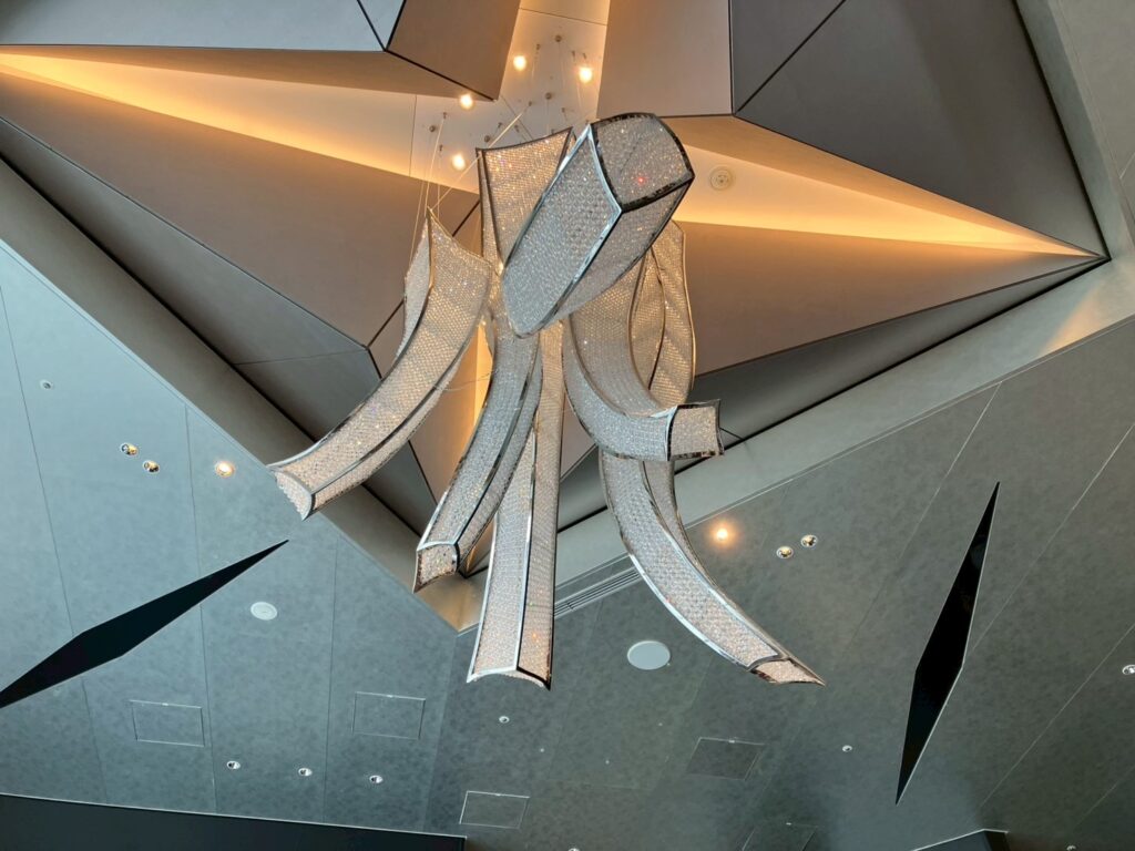 天井にあるシャンデリアは、ハワイの象徴的な花である、プルメリアを表現しているそうです。