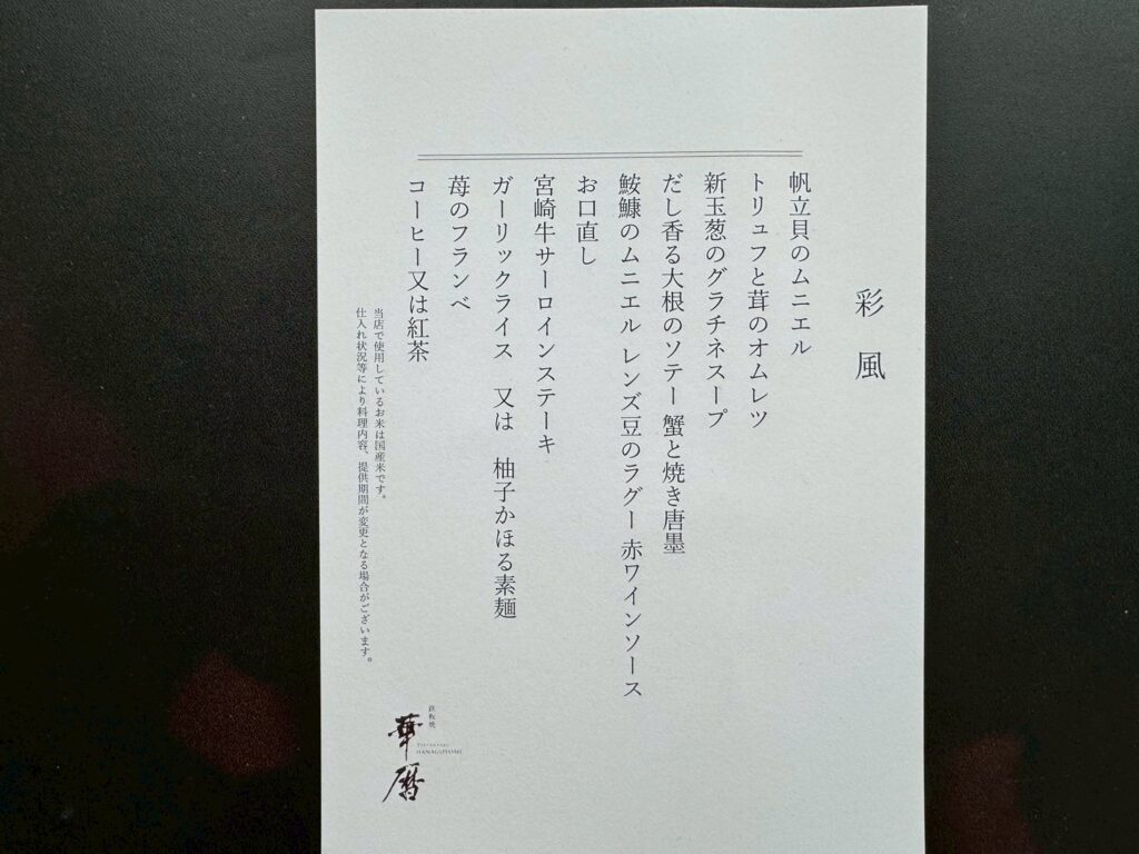 今回は17時30分から予約し、「彩風」というコースを注文しました。