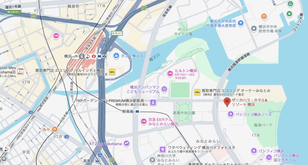 横浜駅からホテルまでは少し離れており、車で6分ほどの距離です。
