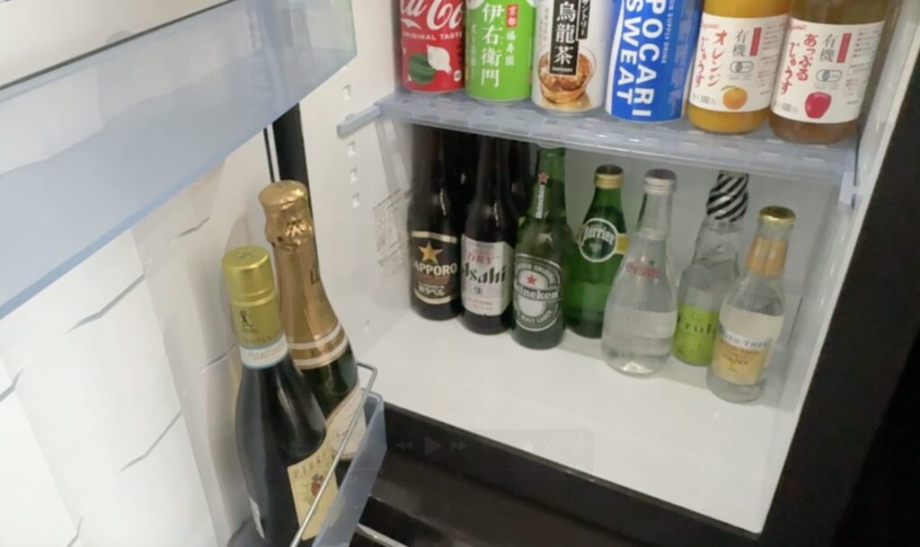 グラスなどが置いてあるカウンターがあり、下には冷蔵庫がありました。