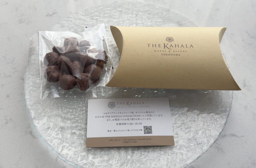 机にはウェルカムスイーツで、マカデミアンナッツチョコレートが置いてありました。
