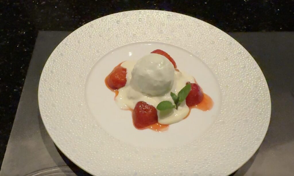 ミニパンケーキに塩アイスと、先ほどフランベしたいちごを添え、マスカルポーネのソースをかけて完成です。