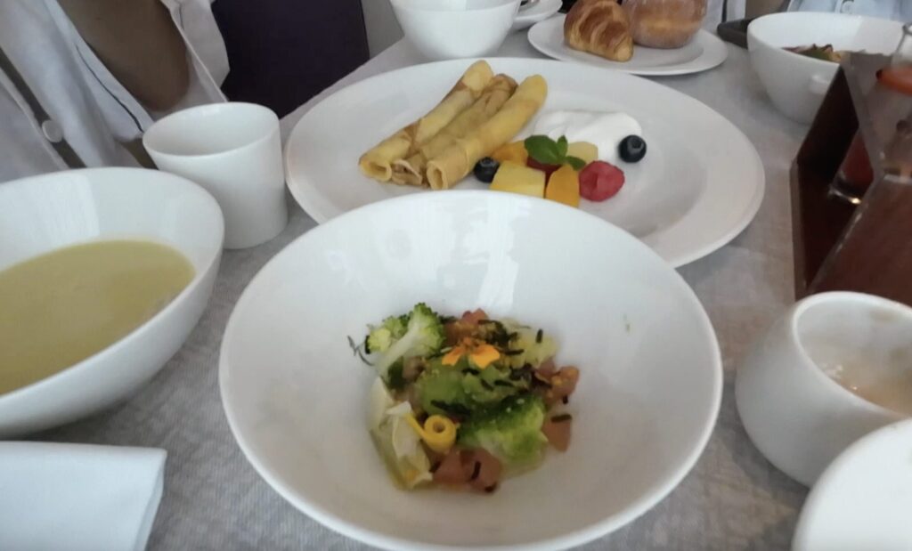 サラダ、アトランティックサーモンマリネ、コーンスープ、トリュフ風味のスクランブルエッグ、マサラダ、クロワッサン、アサイボール、オレンジと野菜ジュースなど色々あります。