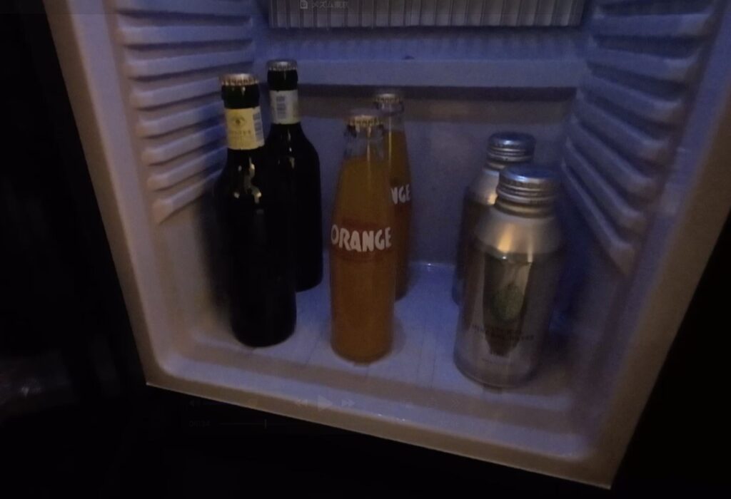 隣には冷蔵庫があり、ビール、オレンジジュース、水が入っていました。