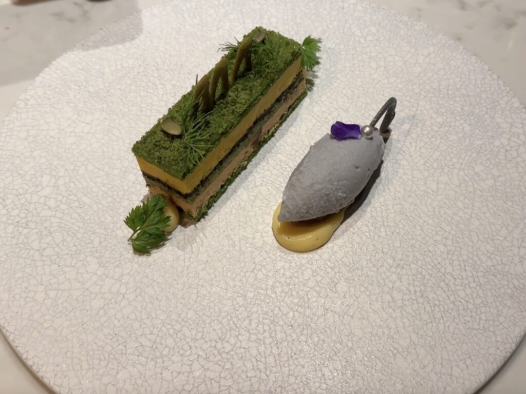 緑は蜂を表現し、春菊のソースと野菜のエチュゲです。