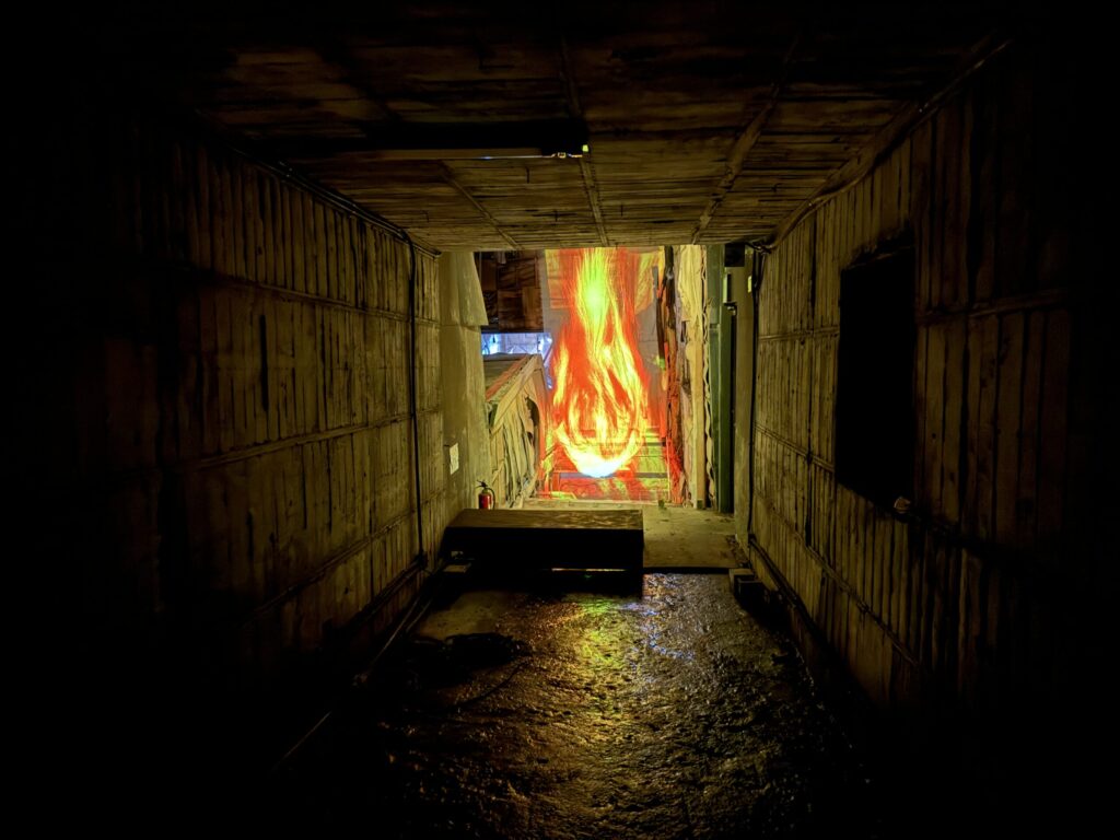 奥には炎を写した映像が流れており、少しおどろおどろしい音楽も流れていました。
