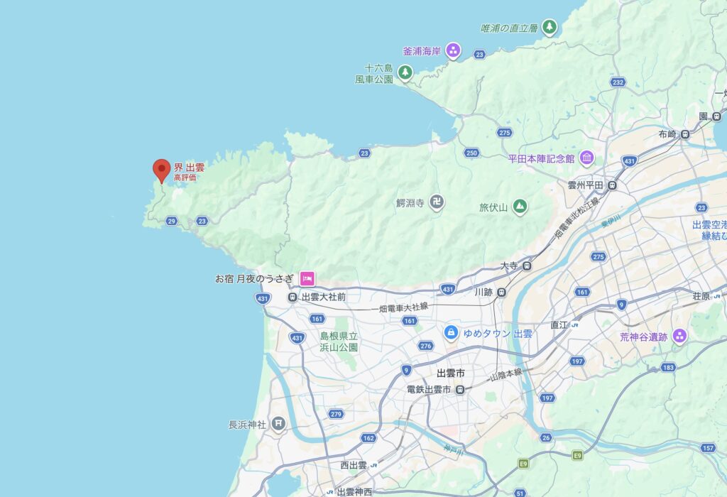 界出雲は出雲空港から車で45分、出雲大社から15分ほどの距離にあります。