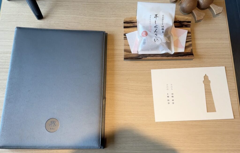 机の上には、館内の説明冊子と茶菓子、灯台の日の入りカードなどがありました。