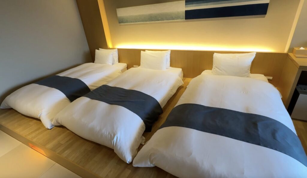 ベッドは3つあり、石見地方の特産品である石州和紙を使ったアートも飾られています。