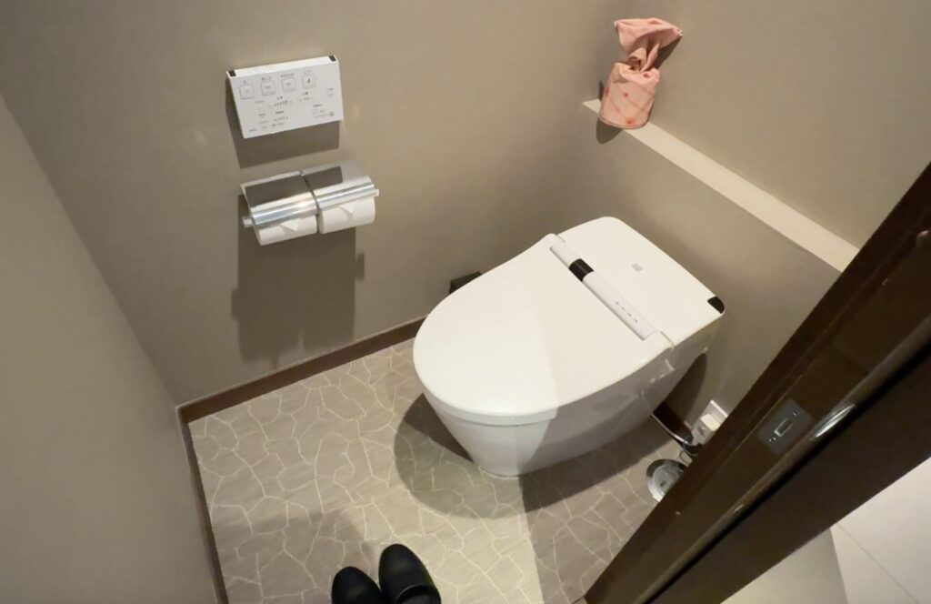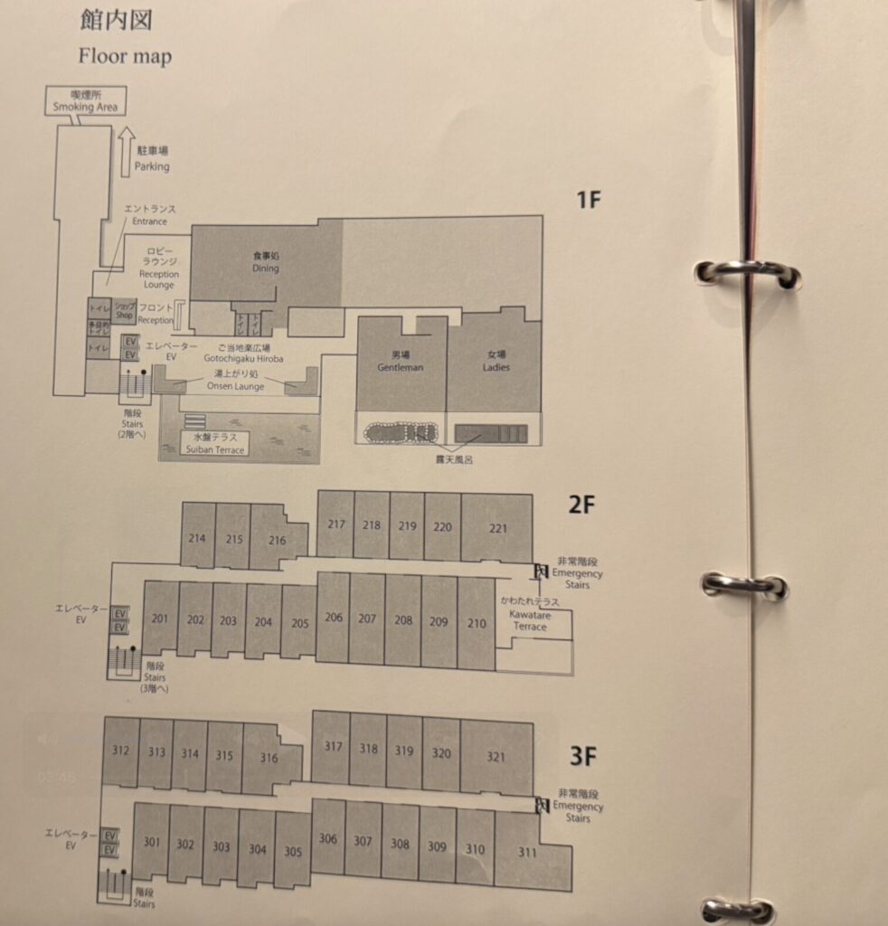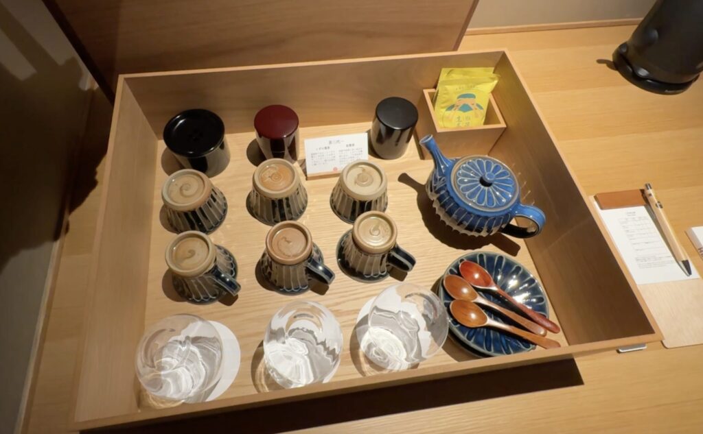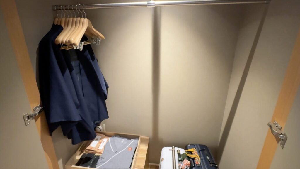 アメニティーが入った風呂敷やパジャマもあり、下には金庫もありました。