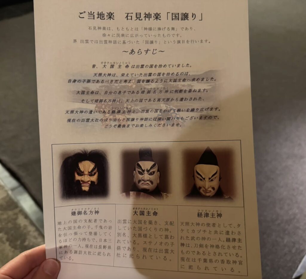 界出雲では、その土地の文化を紹介するご当地楽で、石見神楽の「国譲り」を見ることができます。