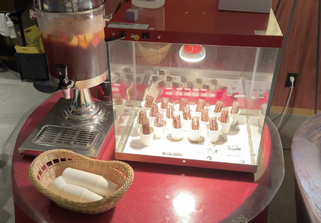 待ち時間の間食べれるように、チョコチュロスとフルーツティーが用意されており、待っている間もゆっくりできるようになっています。