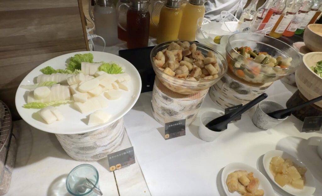 ワサビと山芋、魚の南蛮漬け、チーズ、レーズン、クラッカー等がありました。
