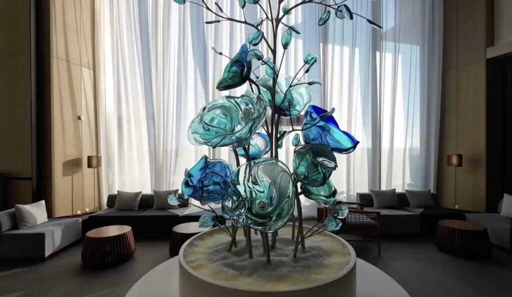 青を基調にしたガラス細工の装飾品も飾られていて、綺麗でした。
