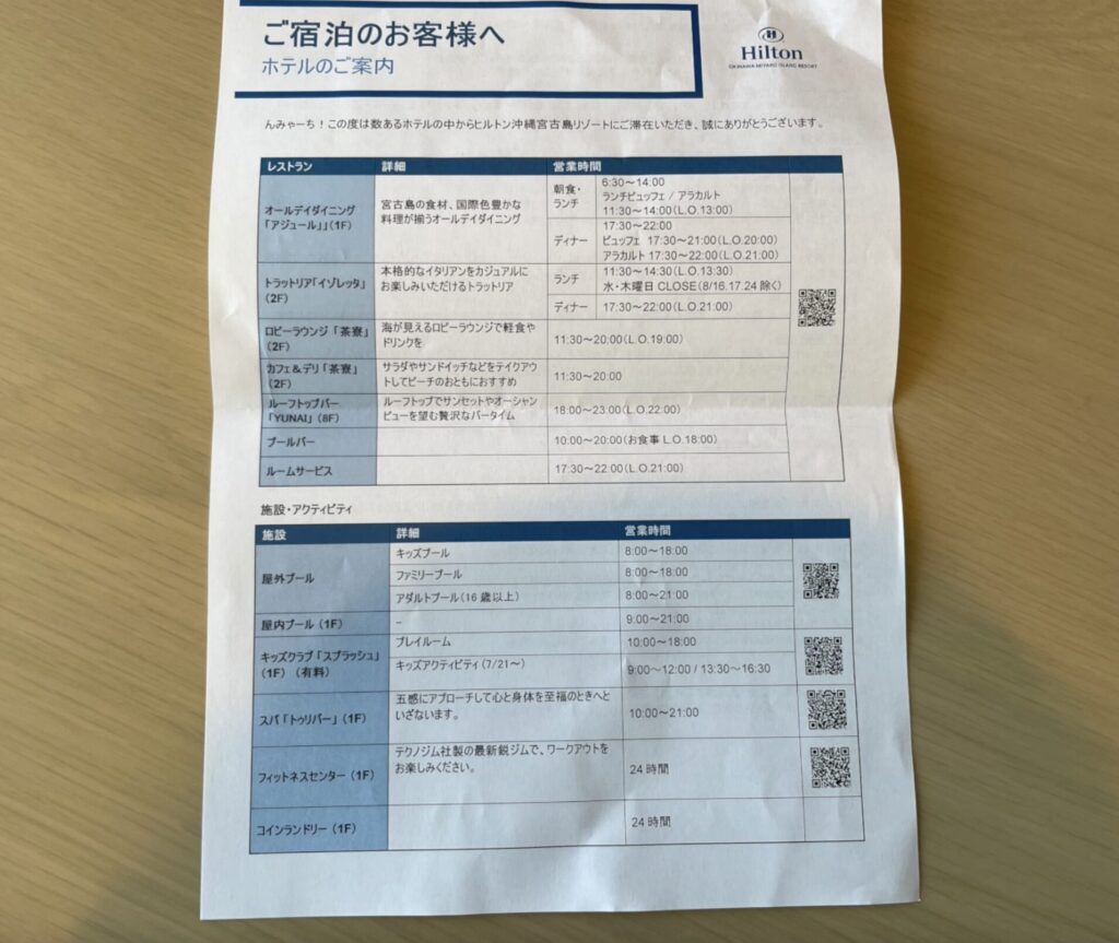 各施設の営業時間が書かれた紙も渡してくれるので、わかりやすかったです。