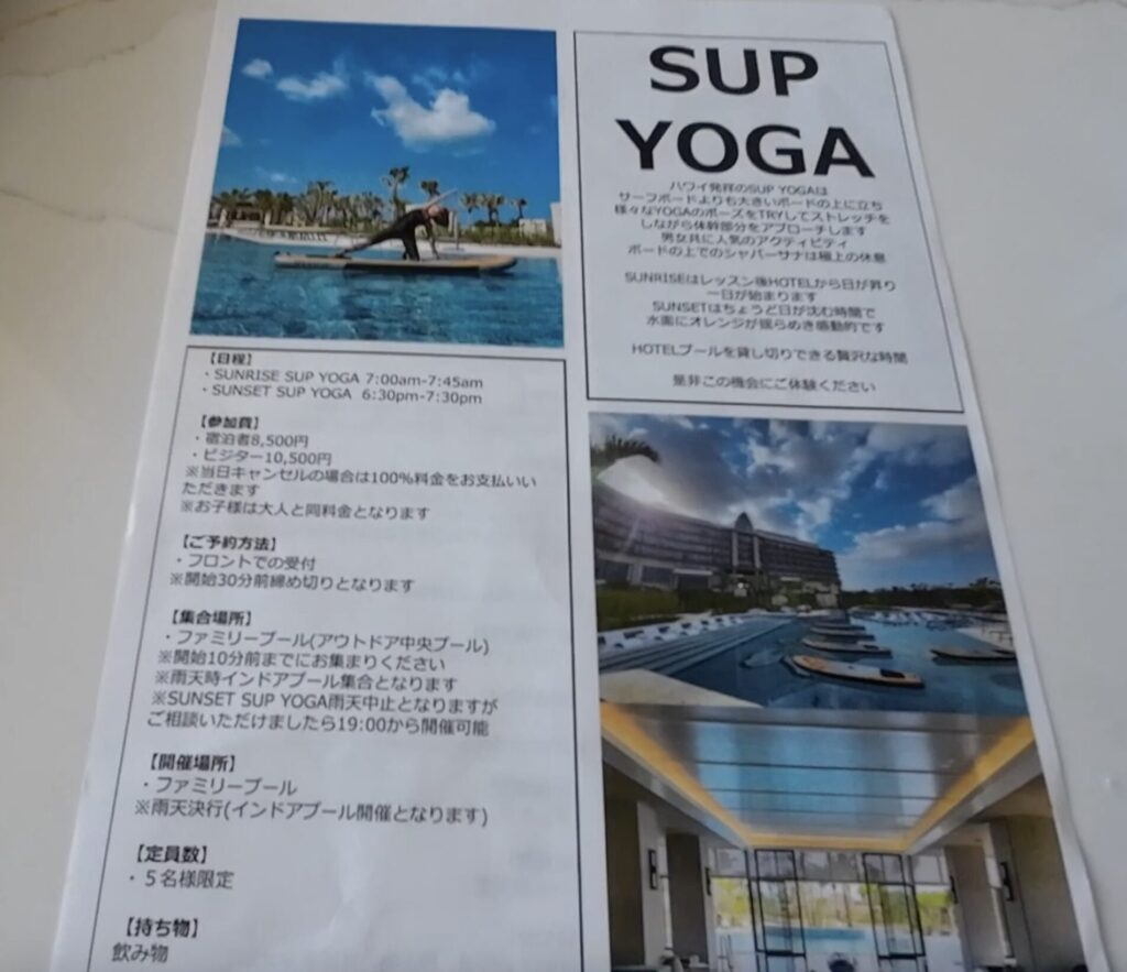 有料ですが、サップの上で行うヨガや朝に行うヨガも開催されています。