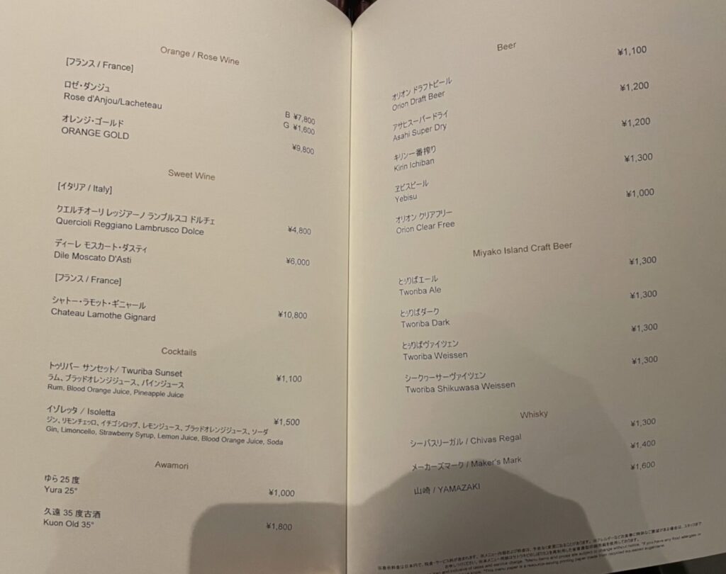 ビール、ワイン、カクテルのほか、宮古島の素材を生かしモクテルなどもあります。